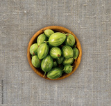 Gooseberry fruit. Gooseberry in ceramic bowl with copy space for text. Top view.