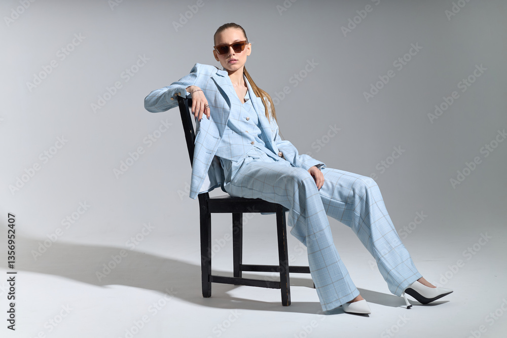 High fashion portrait of young confident female model in blue three-piece suit. Monochrome blue outfit