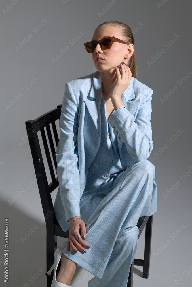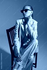 High fashion portrait of young confident female model in blue three-piece suit. Monochrome blue outfit