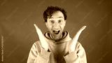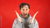 large close up portrait of young curly haired man, joyfully surprised, holding his face with his hands and mouth open, pronouncing word wow on studio red background. Concept - discounts, Black Friday