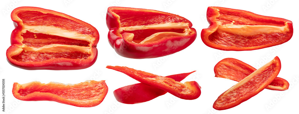 Set of red bell pepper longitudinal slices isolated on white background. File contains clipping paths.