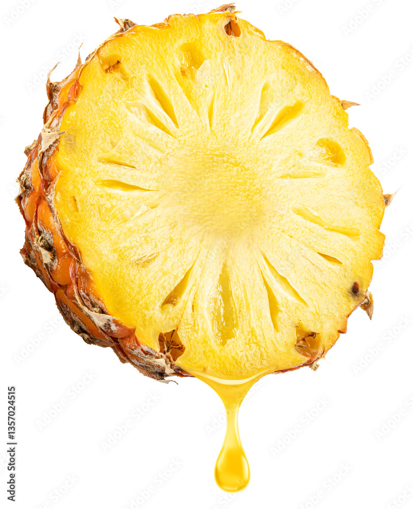 Slice of pineapple fruit and pineapple juice dripping from it on a white background. File includes clipping path.