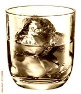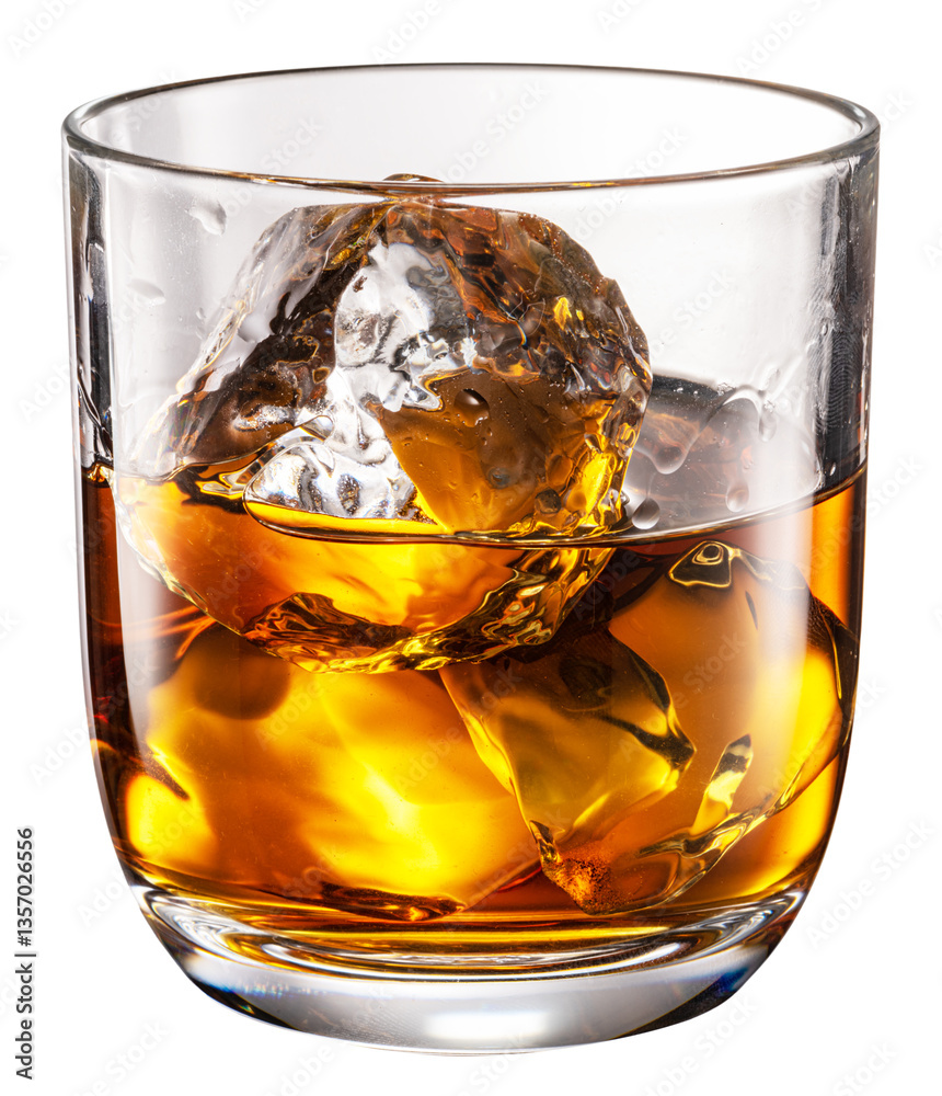 Glass of whiskey with ice cubes inside it isolated on white background. File contains clipping path.