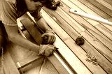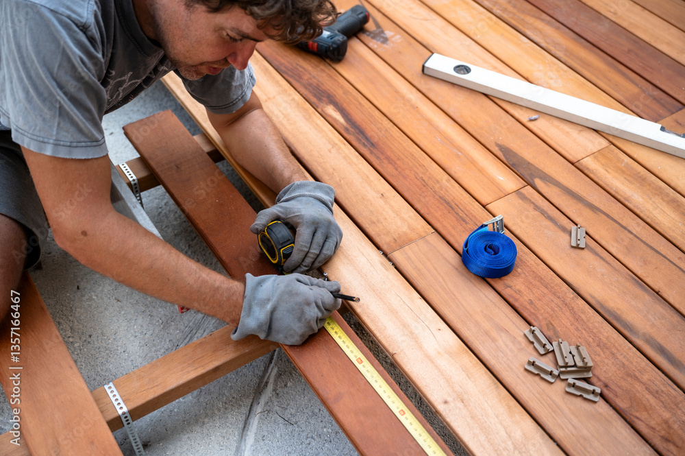 Skilled worker installing wooden deck