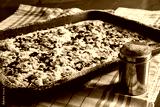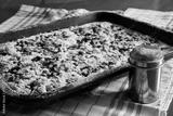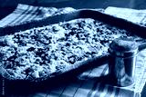 fruitcake and metal sugar bowl on wooden table, sugared fruit pie on baking tray, kitchen towels