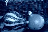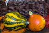 colorful pumpkins, wicker basket as a background, autumn harvest