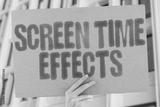 "SCREEN TIME EFFECTS" on a banner highlights modern concerns. DIGITAL. MENTAL. PSYCHOLOGY. TECHNOLOGY. SOCIETY. ADDICTION. WELLBEING