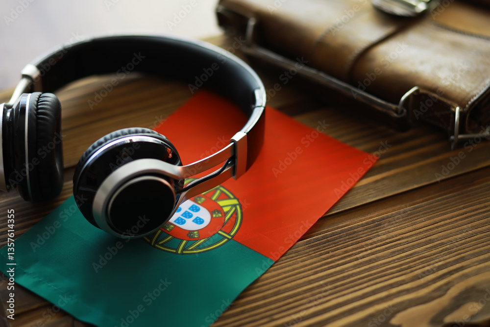 Headphones on Wooden Table with Portugal Flag and Leather Planner in Background