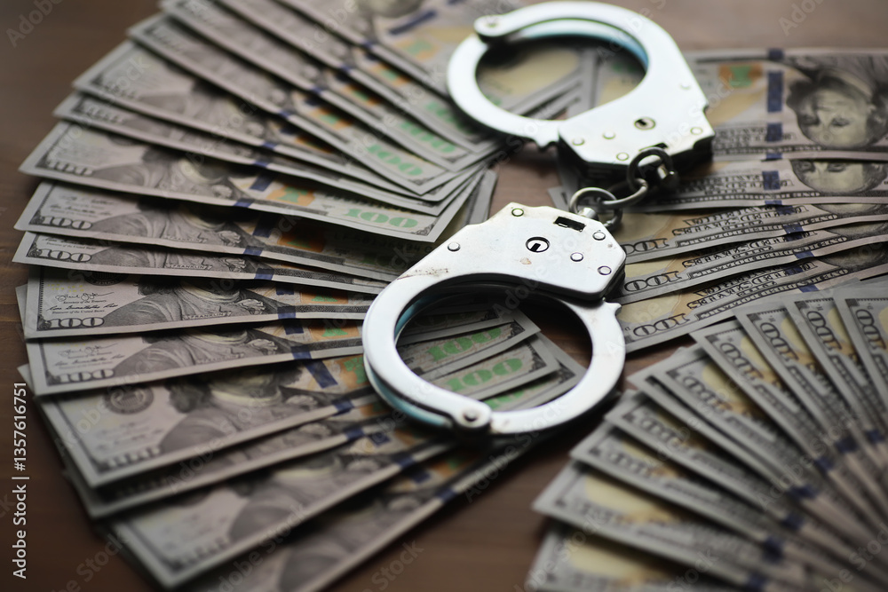 Handcuffs on Piles of US Dollar Bills Representing Financial Crime and Fraud Investigation