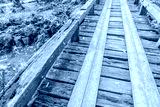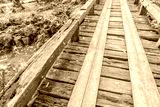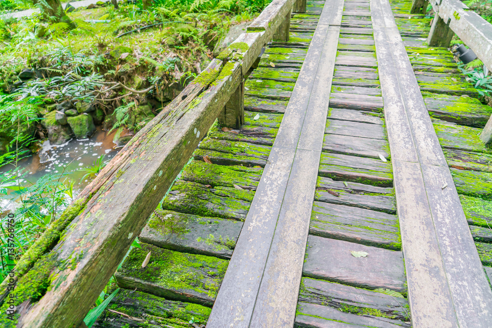 Wooden bridge in tropical green forest covered with moss .