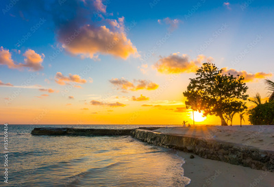 Beautiful sunset with sky over calm sea in tropical Maldives isl