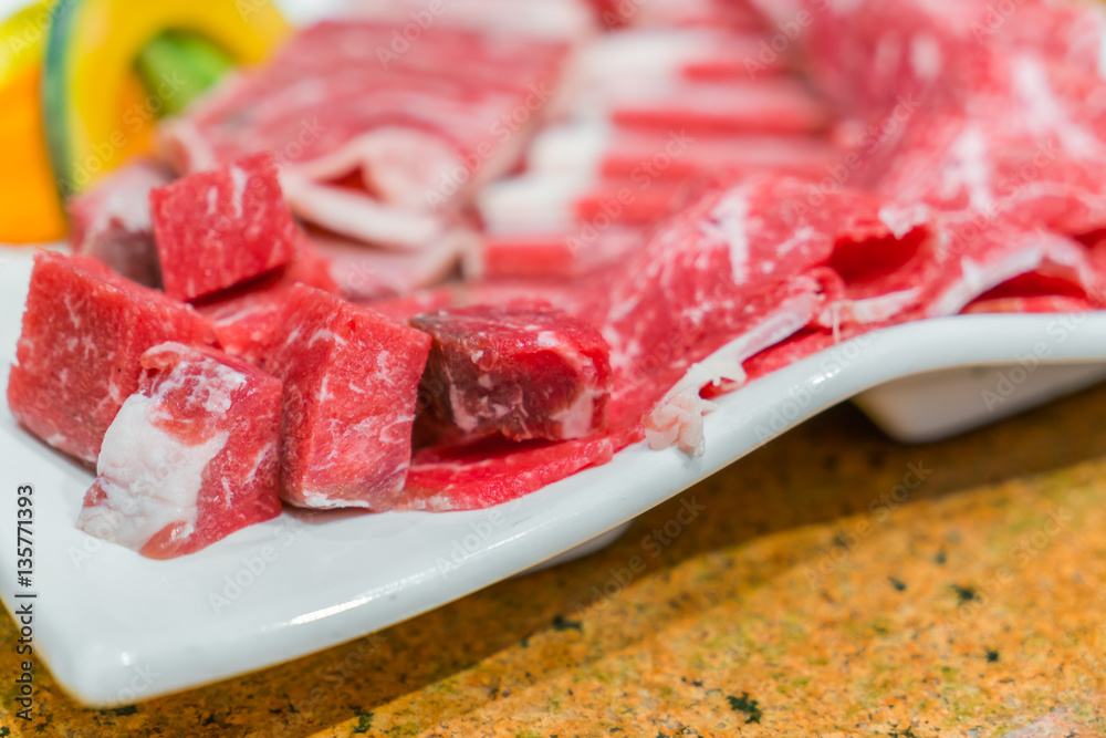 Uncooked raw fresh beef .