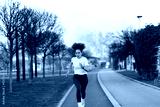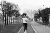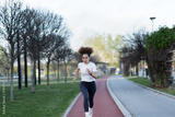A young woman with curly hair runs on a red jogging track in an urban park. She wears a white t-shirt and leggings, focused on her workout in a fresh outdoor environment.