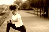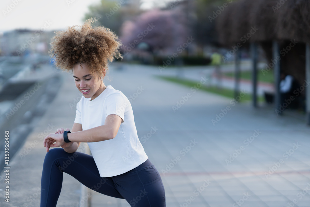 A young woman in athletic wear checks her smartwatch while stretching outdoors near a waterfront. She smiles, enjoying her fitness routine in an urban setting with trees and cityscape in the backgroun