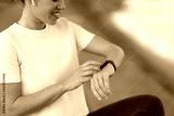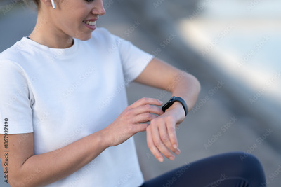 A young woman in athletic wear checks her smartwatch while stretching outdoors near a waterfront. She smiles, enjoying her fitness routine in an urban setting with trees and cityscape in the backgroun