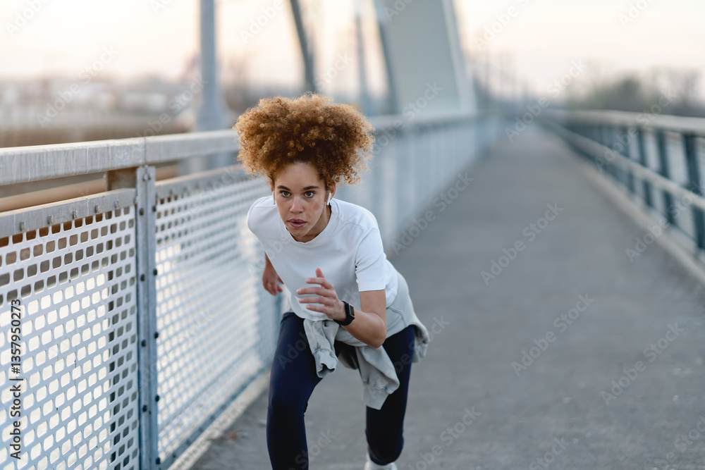 A determined young woman with curly hair runs on a modern bridge during an outdoor workout. She wears a white t-shirt, leggings, and a smartwatch, focused on her fitness goal.