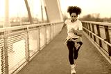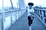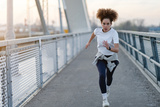 A determined young woman with curly hair runs on a modern bridge during an outdoor workout. She wears a white t-shirt, leggings, and a smartwatch, focused on her fitness goal.