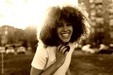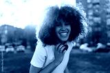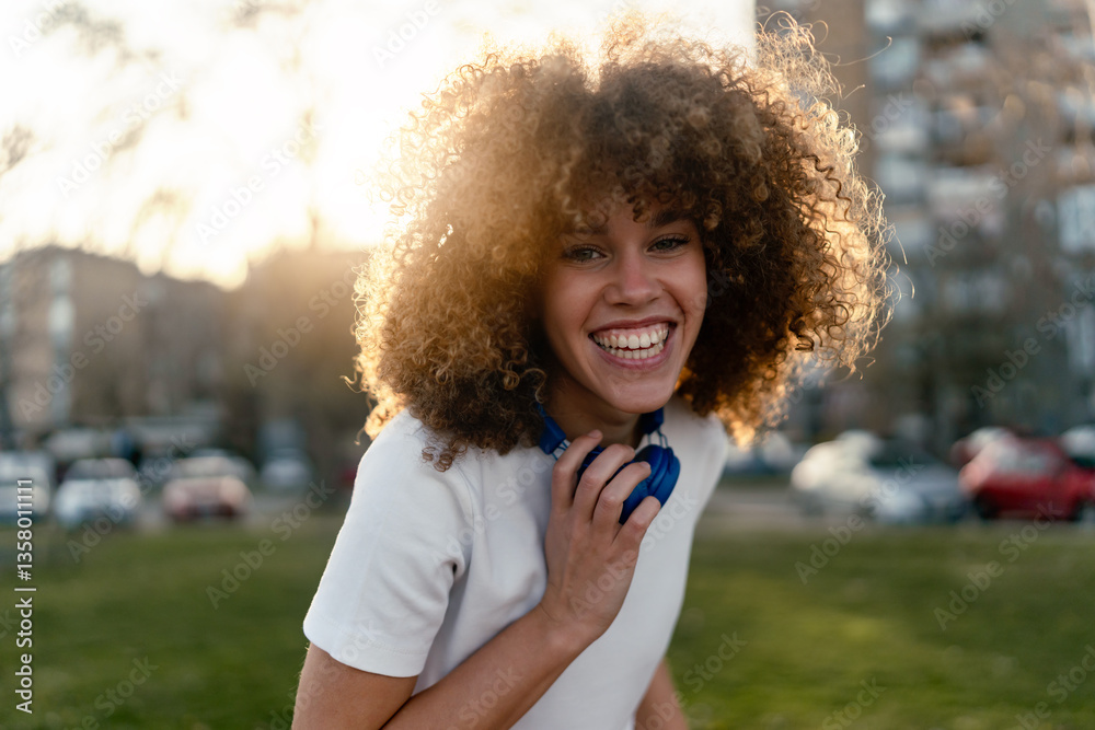 A joyful young woman with voluminous curly hair laughs while standing outdoors in a city park at sunset. She wears a white t-shirt, headphones and a smartwatch, embracing happiness and positivity.