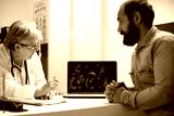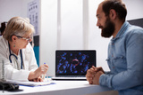 Old female physician and young male patient use laptop to analyze virus cells during consultation. Senior doctor with digital device illustrating enlarged microscopic details of germs to bearded man.