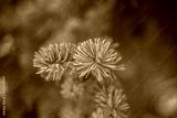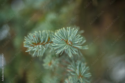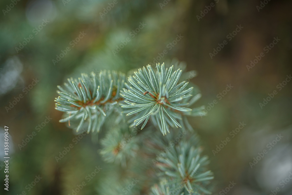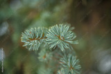 Winter pine branch. Snowflakes on a branch close-up, macro