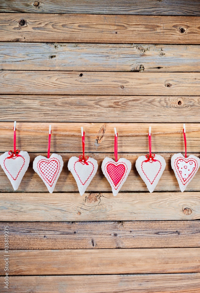 Textile hearts on old rustic wooden background.