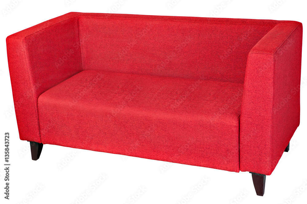 Upholstered 2 seater sofa in red fabric with wooden legs.