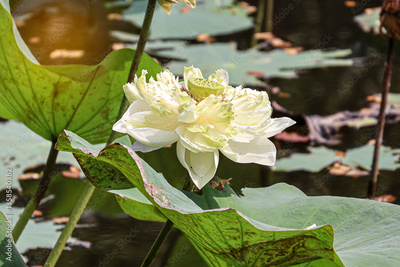 Beautiful big white sacred lotus flower. Indian lotus (Nelumbo nucifera) on pond