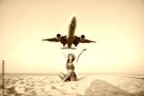 Happy satisfied smiling cheerful joyful traveler girl with open arms watching airplane flying overhead