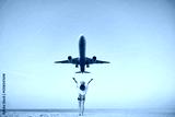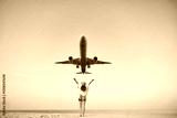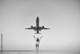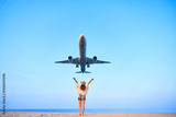 Happy free traveler girl with open arms watching airplane flying overhead, ready to traveling