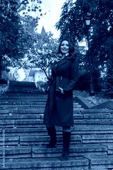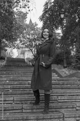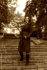 Beautiful woman in a red coat on the stairs. People
