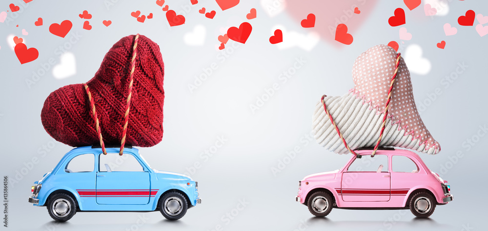 Couple of retro toy cars delivering craft hearts for Valentine's day on gray background with flying hearts