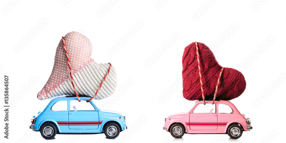 Couple of retro toy cars delivering craft hearts for Valentine's day on white background