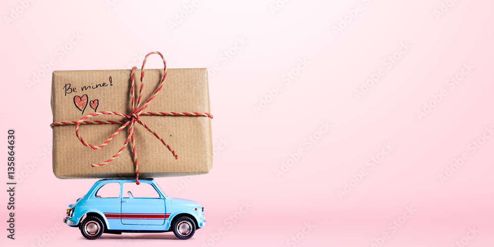 Blue retro toy car delivering gift box with Be Mine caption for Valentine's day on pink background