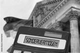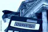 Reichstaggebäude in Berlin, deutsche Flagge und Taschenrechner Sondervermögen