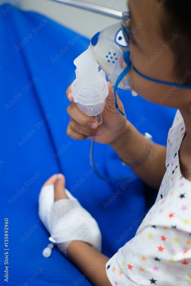 little boy with inhalator mask in hospital
