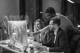 Team collaborating on cybersecurity solutions, analyzing futuristic hologram interfaces in office setting.