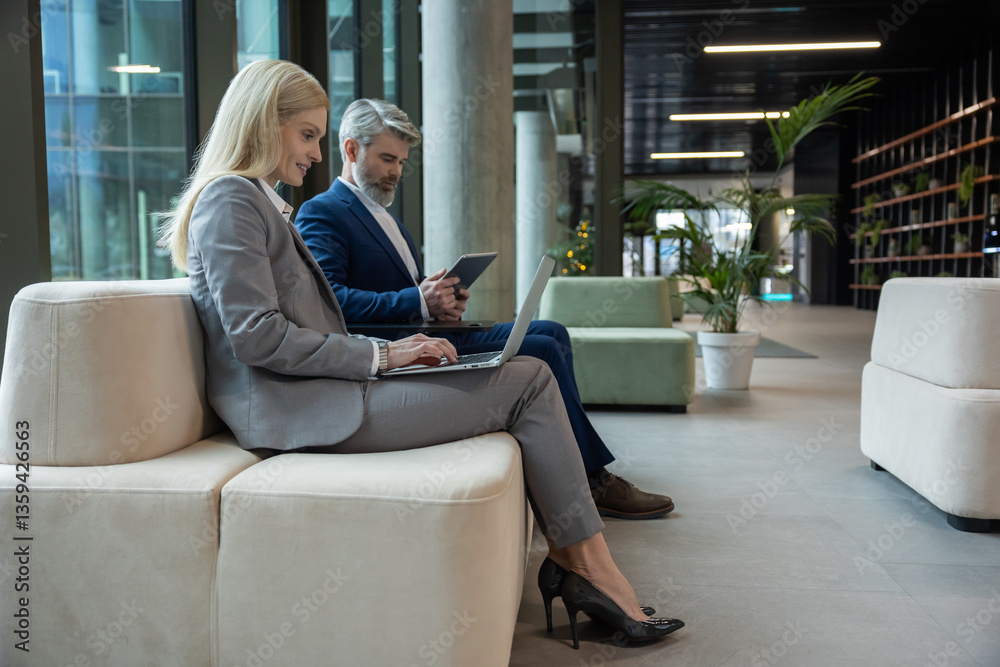 Business partners sitting in the hall with laptops and working together