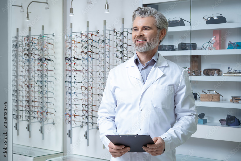 Man in white lab coat standing near eyeglasses stand in optic shop