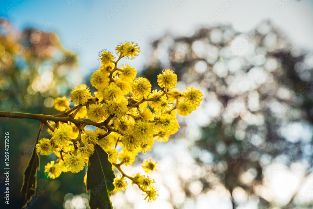 Golden Wattle tree (Acacia pycnantha) blooming during late winter season