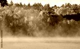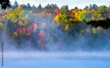 Late-summer, early-autumn morning. Swirling of foggy mist rises from a lake into cool air. Nature display of water states in front of colorful deciduous wetland forest in morning sunshine.