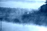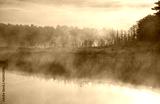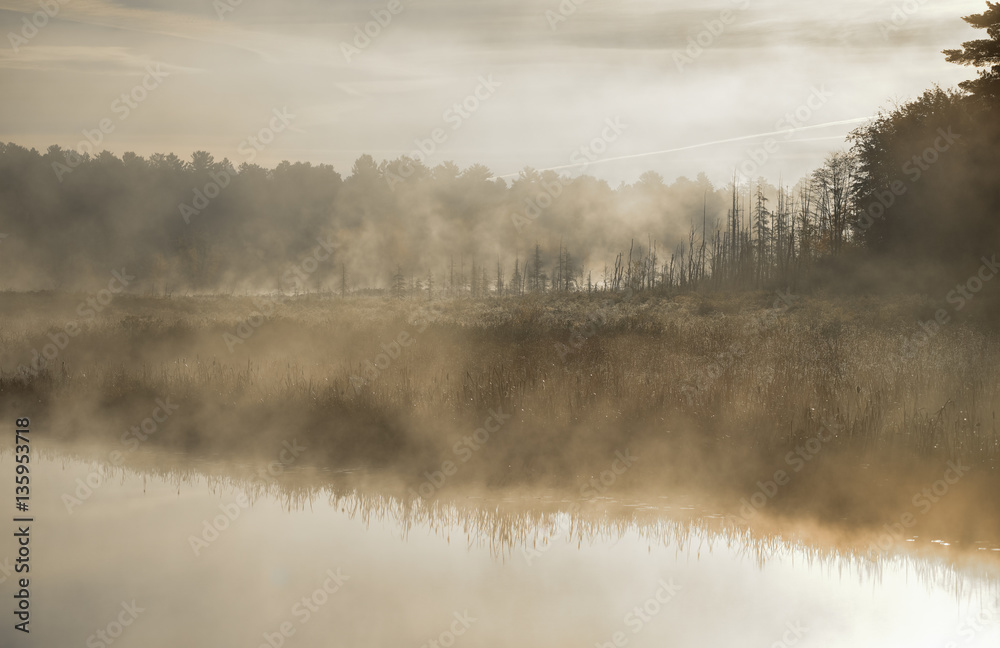 Mist rises from a marsh on an Ontario lake. Contrail in pale summer sky. Sunrise over narrow passage of a lake. A row of swamped, dying spruce trees is enshrouded in fog.