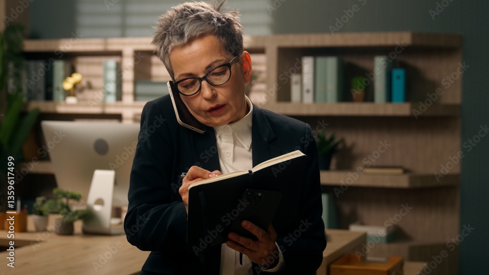 Stress busy multitasking business lady Caucasian senior woman middle-aged businesswoman mature female working in office talking phone writing notes answer call another smartphone talk with two phones