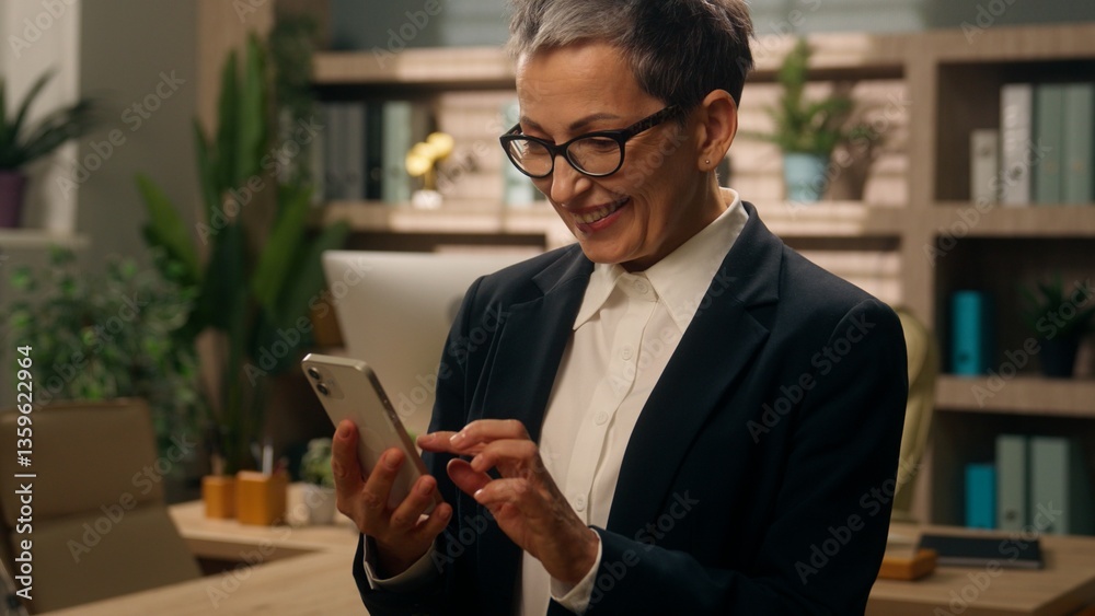 In office happy smiling old Caucasian woman business female businesswoman mature senior employer middle-aged CEO entrepreneur using mobile phone social media smartphone amazed surprised wonder app