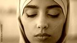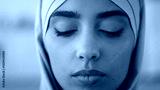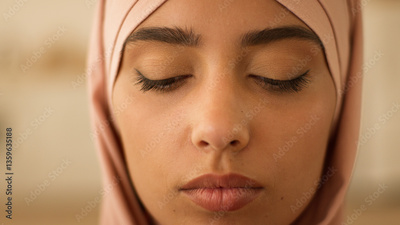 Close up face sad upset stressed Arabian woman Indian Muslim Islamic girl female lady religion in hijab disappointed frustrated grief thinking pensive looking down problem ill discrimination indoors