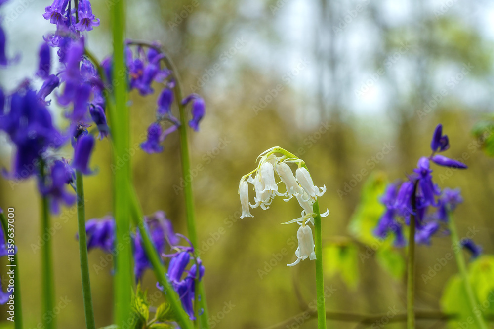 Blossoming lovely white bluebell among blue bluebells flowers in the spring time Hallerbos forest, Halle, Belgium. Natural botanical background, close-up image