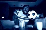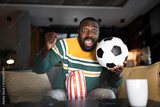 A surprised man reacts dramatically while watching a soccer match on TV at home. He sits on a couch with a bowl of popcorn as a soccer ball seemingly comes toward him, adding excitement to the moment.