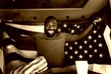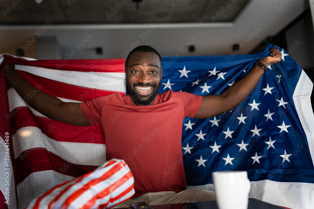 A joyful man proudly holds up an American flag while watching a sports event at home. He is full of enthusiasm, celebrating patriotism with a big smile, popcorn, and excitement.