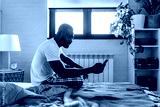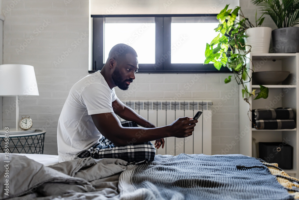 A man sits on the edge of his bed in a modern, minimalist bedroom, checking his smartphone. The room is bathed in natural light, creating a peaceful and cozy morning atmosphere.