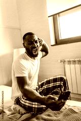 A young man in pajamas sits on his bed in the morning, yawning while holding a smartphone. He appears tired and groggy, struggling to wake up as sunlight enters the room.