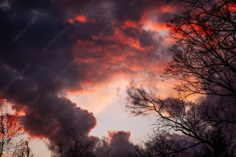 Dramatic Sunset Sky with Silhouetted Bare Trees. A moody and dramatic photograph of a sunset sky filled with deep purple and fiery orange clouds. The silhouettes of bare tree branches add contrast